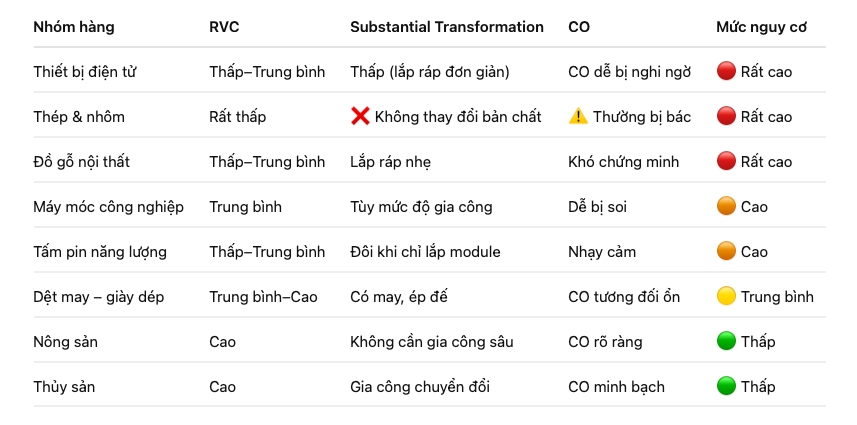Các mặt hàng này nằm trong nhóm nguy cơ cao bị coi là transhipment vì lệ thuộc vào Trung Quốc cả về nguyên liệu, linh kiện, quá trình gia tăng giá trị thay đổi bản chất sản phẩm tại Việt Nam cũng như có hồ sơ chứng minh được nguồn gốc xuất xứ. Cụ thể thông thường để gắn chữ “Made in Vietnam” thì theo quy tắc RVC, hàm lượng giá trị nội địa phải > 40%. Ðây là nguyên tắc được dùng trong các hiệp định thương mại (FTA, WTO). Nhiều sản phẩm hiện nay lắp ráp tại Việt Nam, được doanh nghiệp tự gắn chữ “Made in Vietnam” nhưng không đáp ứng được tỷ trọng giá trị đóng góp > 40% tại Việt Nam theo nguyên tắc này.